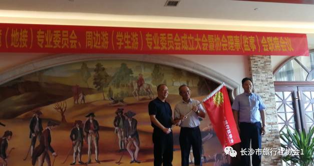 王应荣会长向入境(地接)专业委员会主任委员许剑和周边游(学生游)专业委员会主任委员徐湘江授旗